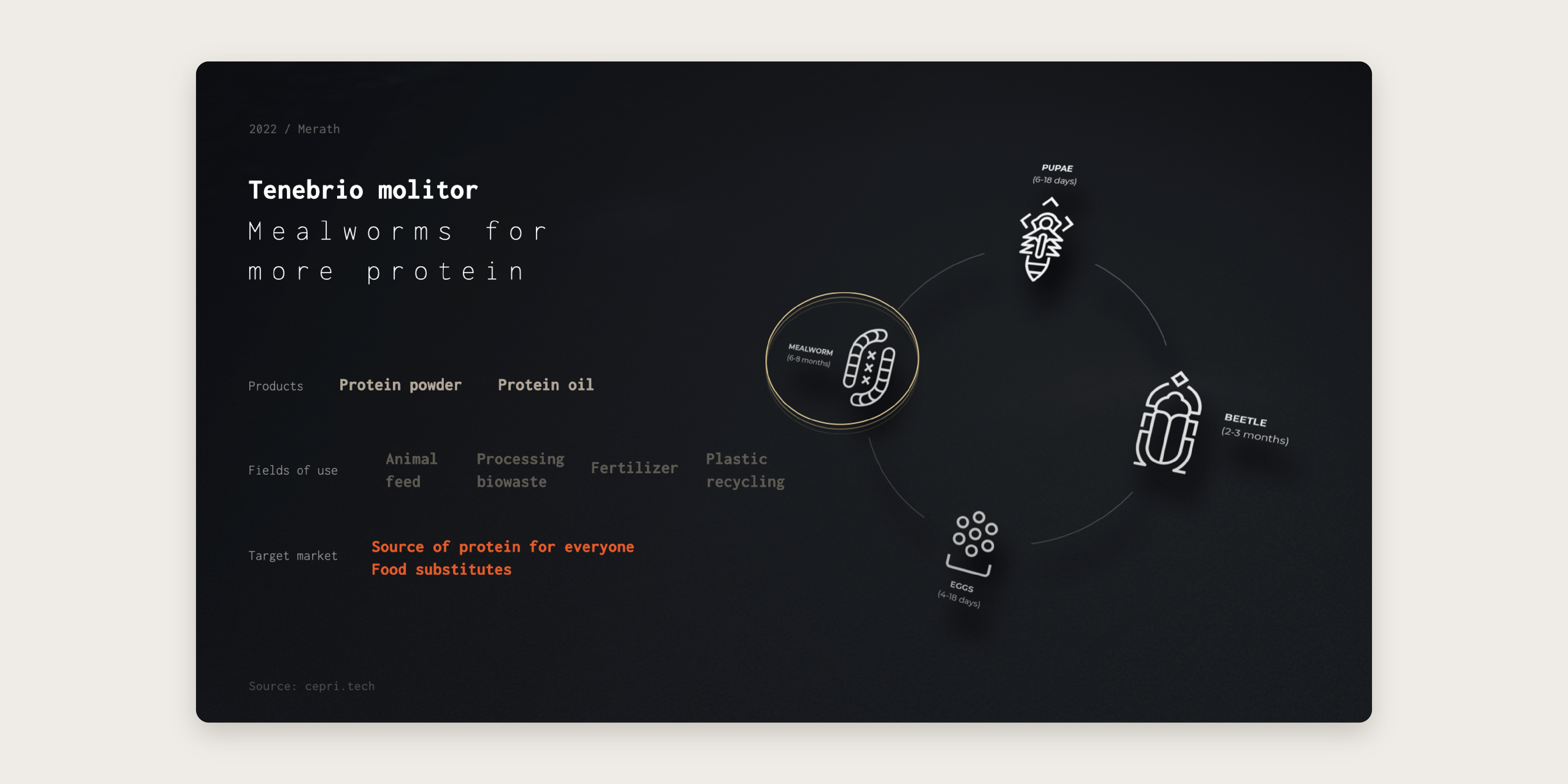 Mealworm protein has proven to be a promising and sustainable source of protein. Not only is it rich in essential nutrients, it is also extremely resource-efficient and environmentally friendly to produce. Mealworms can be bred in vertical farms and require less water, land and feed compared to conventional livestock farming. Their rapid growth and high reproduction rate make them an ideal source of protein for the future.